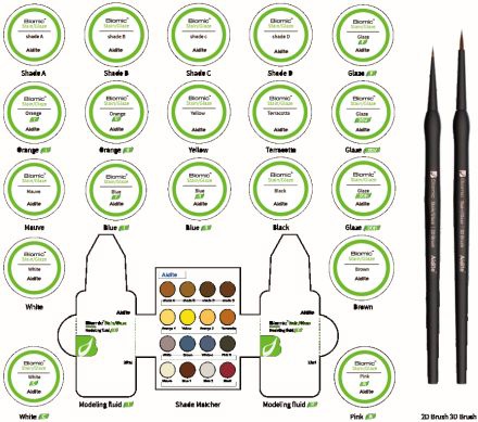 Farbičky 2D a 3D je možné miešať. Balenie obsahuje: 2D farby (Shade A, Shade B, Shade C, Shade D, Blue 1, Blue 2, White, White-C, Brown, Terracotta, Orange 1, Orange 2, Mauve, Yellow, Pink -R), 3D farby (3DN, 3DV), Coloring liquid 1, Coloring liquid 2, Glaze-F, 2D štetec, 3D štetec a 16-farebnú paletku.
