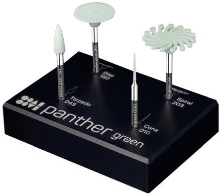 Sada špeciálnych leštítok zelenej farby na jemné kontúrovanie ešte nesintrovaného zirkónu. Vrátane nástroja na odstránenie držiakov po frézovaní.