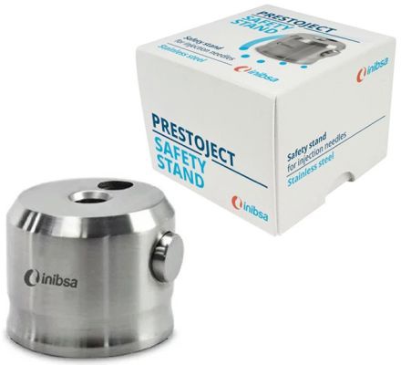 Ťažký stabilný nerezový stojan s mechanickým tlačidlom na držanie a znovuzatvorenie použitej ihly do platového obalu. Eliminuje riziko zranenia a kontaminácie počas ošetrenia.