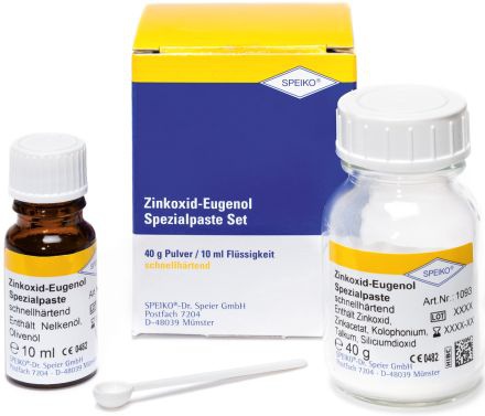 Čistý zinkoxidový prášok a eugenolová tekutina na prípravu dentálnych pást. Vhodné ako dočasná výplň zuba, dočasná výplň koreňového kanálika alebo termálne izolačný materiál pre cementové a kovové výplne.