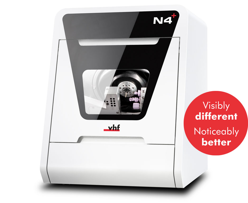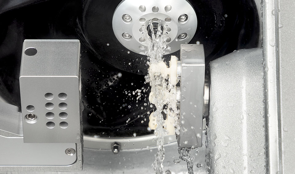 The N4+ is an efficient wet processing machine for grinding and milling glass ceramic, composite, and zircon blocks, as well as CoCr and titanium abutments. It impresses not only thanks to its high precision and fast drives, but also thanks to its ultra-compact housing with closed fluid circuit. Eight fine nozzles on the spindle direct the cooling liquid precisely onto the effective area between the tools and workpiece, delivering an optimal cooling effect.
